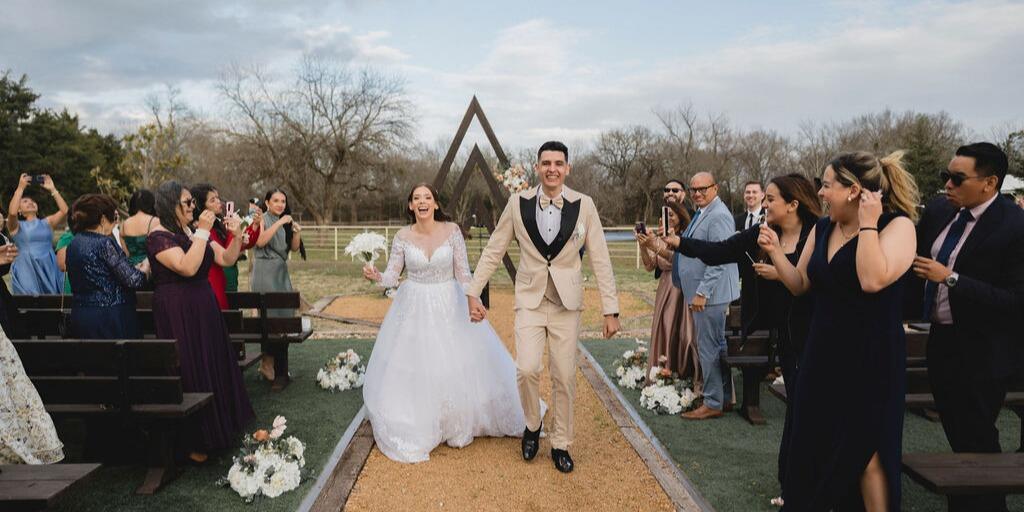 The Avenue is an enchanting outdoor party venues in DFW with a unique triangular arch, offering a stunning backdrop for photographs. The arch can be elegantly styled with florals or left simple for a natural look. This picturesque venue is perfect for wedding ceremonies, accommodating up to 100 guests. The rustic charm is evident with black wooden benches for the first two rows and additional benches behind.